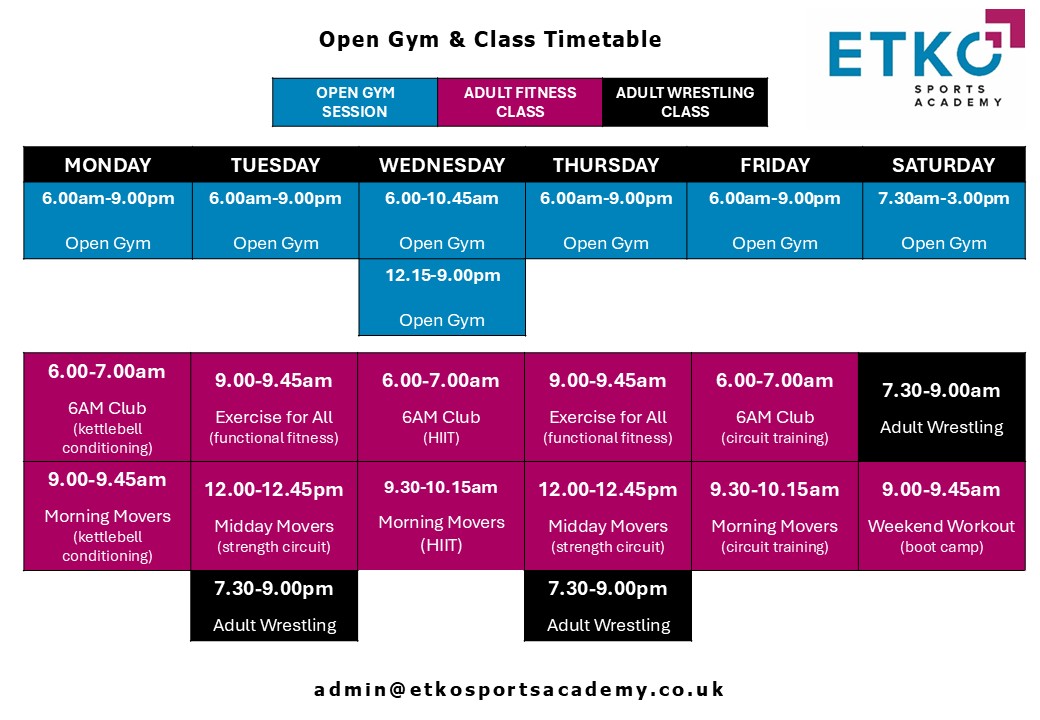 If our scheduled open gym sessions are not convenient for you, please feel free to contact us at admin@etkosportsacademy.co.uk and we will do our best to accommodate your needs.